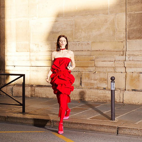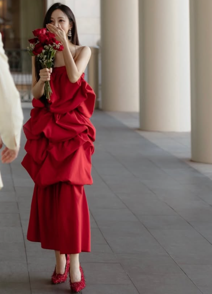 튜브탑 드레스로 드러난 어깨라인, 겹겹이 쌓인 붉은 스커트, 그리고 레드 립과 힐까지 완벽하게 매치된 스타일링은 웨딩드레스의 고정관념을 깨뜨렸죠.